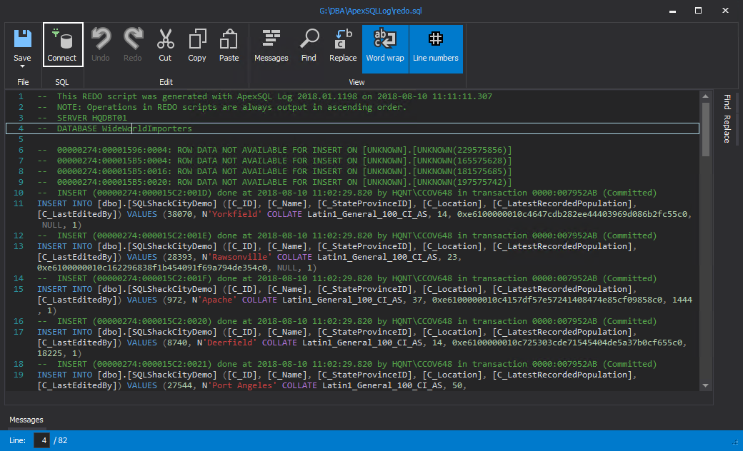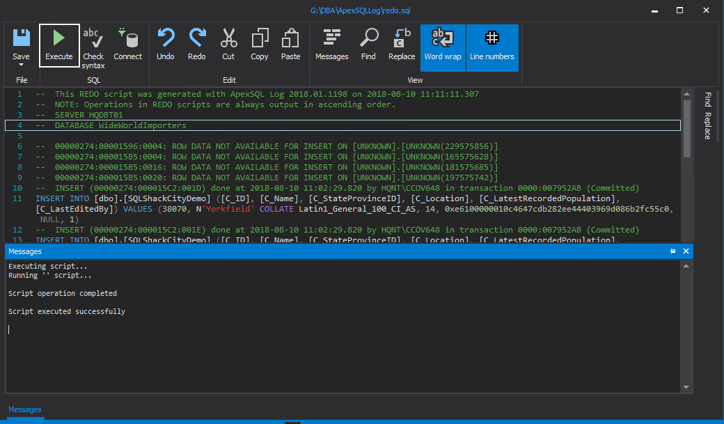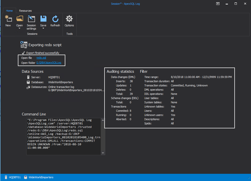 Initiate the transaction log reader at the source database to read all of the transactions that were committed during our migration window. In doing so, you will generate the SQL script of the delta changes since the last FULL backup. The available options and configurations are easy to customize. The process of scripting the committed transactions (redo.sql) is very simple and the generated SQL can be applied to target at a later point in time to synchronize any differences that happened during the backup and restore window.