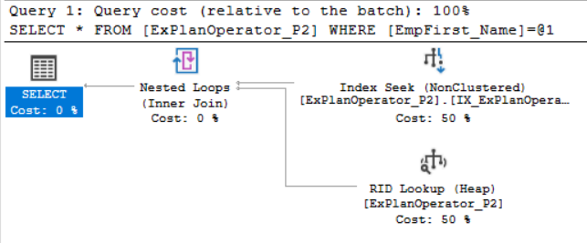If you look at the RID Lookup operator in the SQL Server execution plan, you will see that the cost of that operator is high related to the overall weight of the plan, which is 50% in our example. This is due to the additional I/O overhead of the two different operations that are performed instead of a single one, before combining it with a Nested Loops operation. This overhead can be neglected when processing small number of rows. But if you are working with huge number of records, it is better to tune that query, rewrite the query by limiting the retrieved columns or create a covering index for that query. If the RID Lookup is eliminated by creating a covering index, the Nested Loops operator would not be needed in this SQL Server execution plan. To dig deeply in the covering index concept, check Working with different SQL Server indexes types.