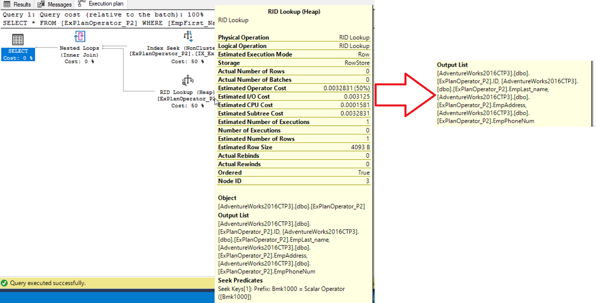 A RID is a row locator that includes information about the location of that record such as the database file, the page, the slot numbers that helps to identify the location of the row quickly. If you move the mouse to point to the RID Lookup on the generated SQL Server execution plan to view the tooltip of that operator, you will see in the Output List, the list of columns that are requested by the query and returned by this operator, as these columns are not located in the Non-Clustered index, as shown below: