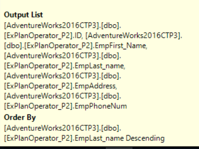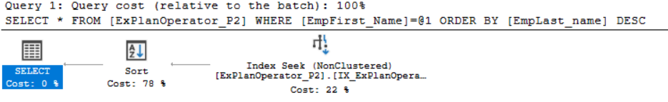 Assume that we run the below SELECT statement that returned the list of employees with a specific EmpFirst_Name value from the ExPlanOperator_P2 table, sorted by the EmpLast_Name column values descending, using the ORDER BY clause: