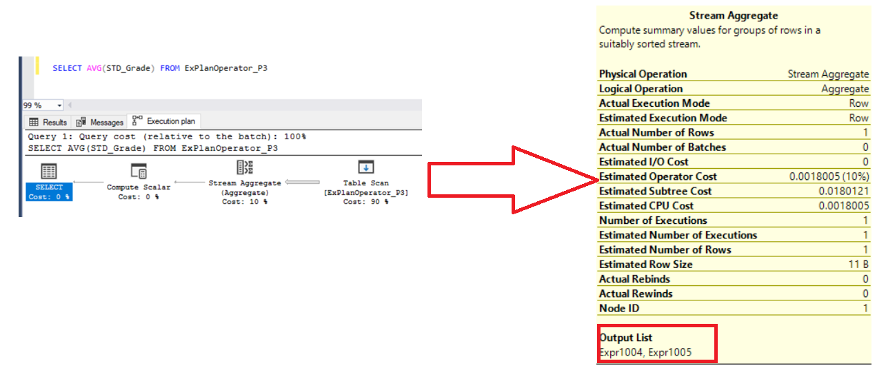 The Aggregate Operator is mainly used to calculate the aggregate expressions in the submitted query, by grouping the values of an aggregated column. The aggregate expressions include the MIN, MAX, COUNT, AVG, SUM operations. Let us run the below SELECT statement that retrieved the top 10 students who got the highest grade. And we will include the Actual SQL Execution Plan of the query. This can be achieved by aggregating the grades of the students to get the maximum grades using the MAX aggregate function. If all information about these top students is required, we should add all these columns in the GROUP BY clause, as shown below: