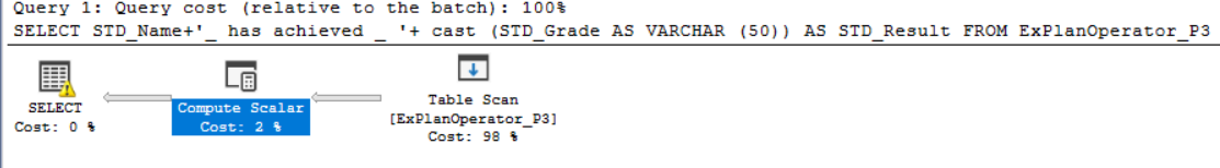 You will see from the execution plan, generated after executing the query, that the SQL Server Engine uses the Compute Scalar operator to perform a concatenation for the two specified columns to return a new scalar value, as shown below: