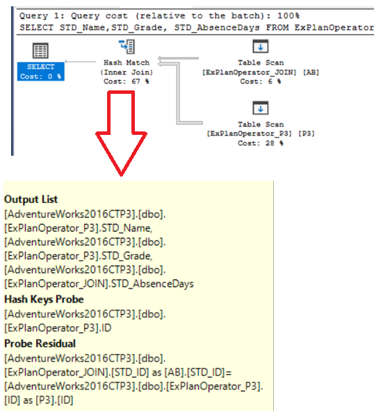 You will see from the Execution Plan generated after executing the query that, after reading data from the two joined table, the SQL Server Engine uses the Hash Match Join operator, in which it fills the hash table with data from the small, also called Probe table, then process the second large table, also called Build table, depending on the hash table values, to speed up the access to the requested data, as shown below: