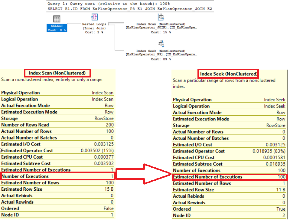 From the SQL Execution Plan, generated after executing the query, you can see that the SQL Server Engine joins the two tables using the Nested Loops Join operator, but performing an Index Scan operation for the outer input one time then performing an Index Seek operation 100 times for the inner input, as shown below: