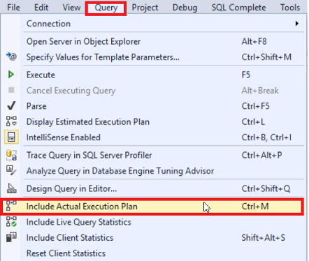 Choose the Include Actual Execution Plan option from the Query menu, as shown below: