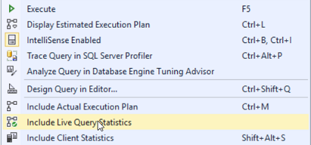Choose the Include Live Query Statistics option from the Query menu, as shown below: