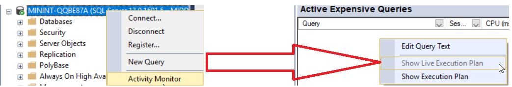 Open the Activity Monitor window and right-click on the target query from the Active Expensive Queries section then choose the Show Live Execution Plan option as shown below: