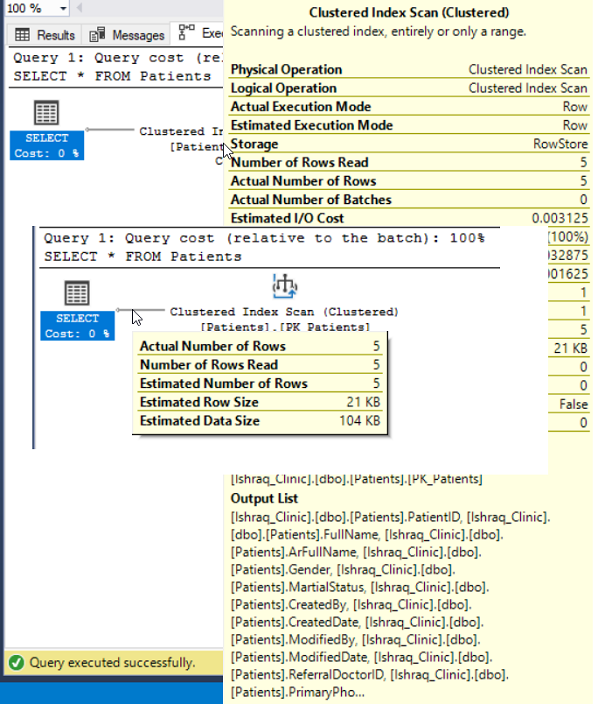 The graphical view of the SQL Server Execution Plan is the most common and friendly plan format, that provides us with a quick and easy way to read the plan and analyze it. The graphical views include the Actual, Estimated and Live Query Statistics plans discussed earlier in this article. The only dark point of the graphical format of the execution plan is that the execution details are hidden behind the plan arrows and operators’ properties, as shown below: