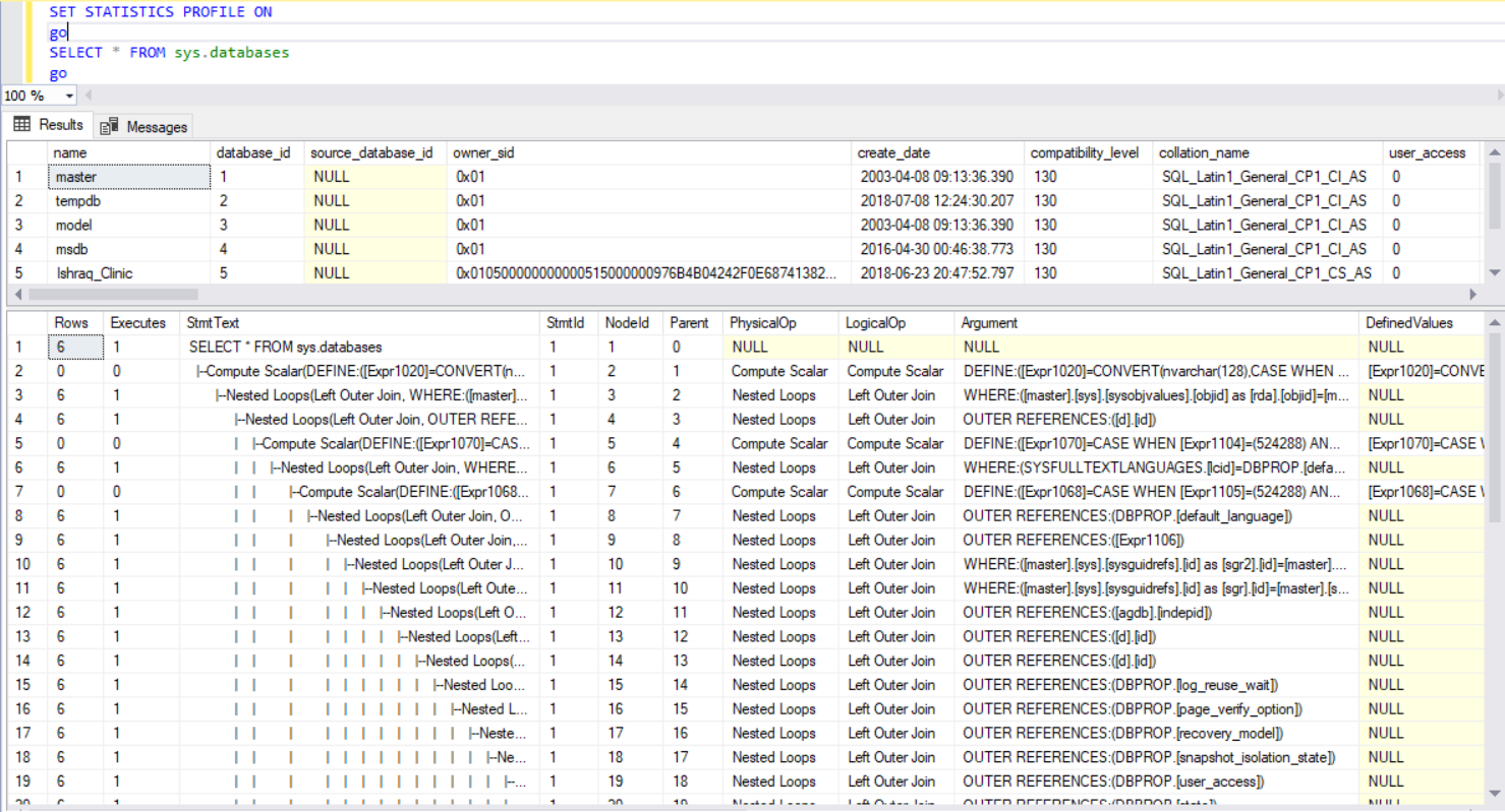 STATISTICS PROFILE: Displays the Actual Execution Plan of the query with complete set of details, as shown below (see how the query results are shown):