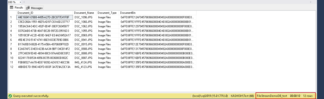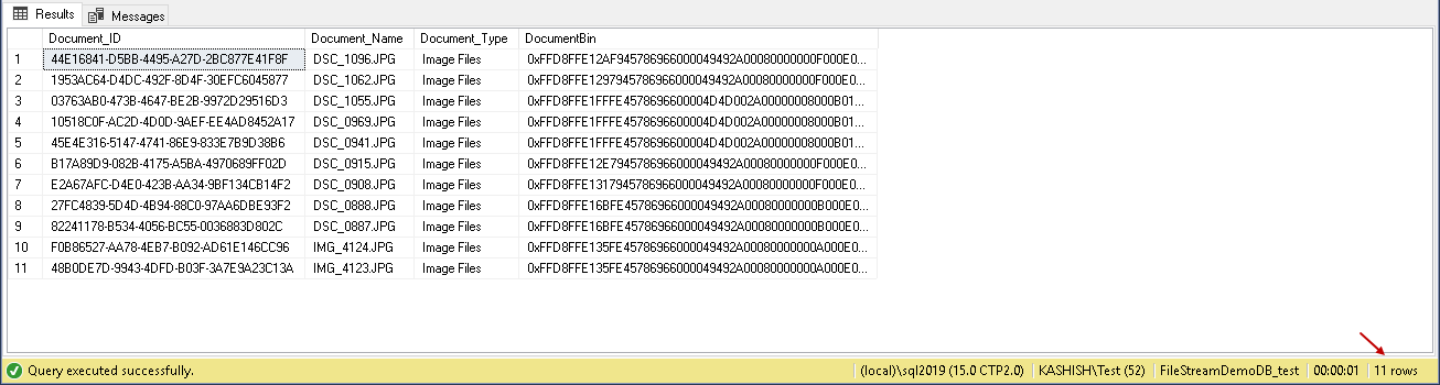 12ALTER DATABASE FileStreamDemoDB_test SET MULTI_USERGOWe can access the database now. Previously we were having 12 rows while the number of rows in the FILESTREAM table is 11, it shows that row is deleted by the DBCC CHECKDB command.