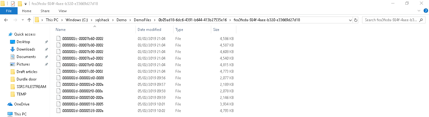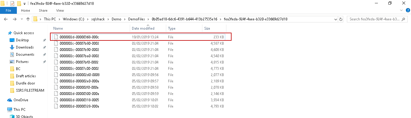 FILESTREAM container files do not have any extension. It also has the name in the form of metadata. Now let us rename the existing file ‘Rajendra.PNG’ in the FILESTREAM format. I renamed the file to the highlighted name ‘0000002d-00000368-000c’. We can note here that it does not have any extension with its name.