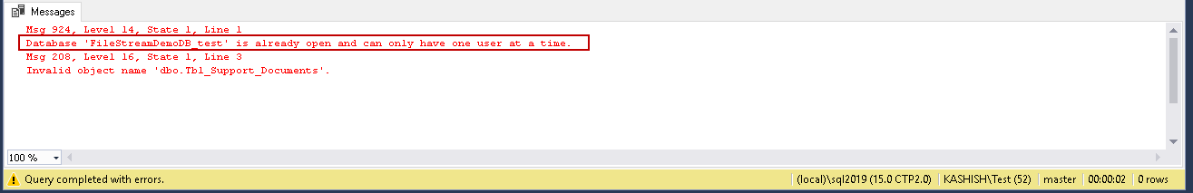 12ALTER DATABASE FileStreamDemoDB_test SET SINGLE_USER WITH ROLLBACK IMMEDIATEGOThis command kills all of the existing connections in the database and put the database into an existing mode.
