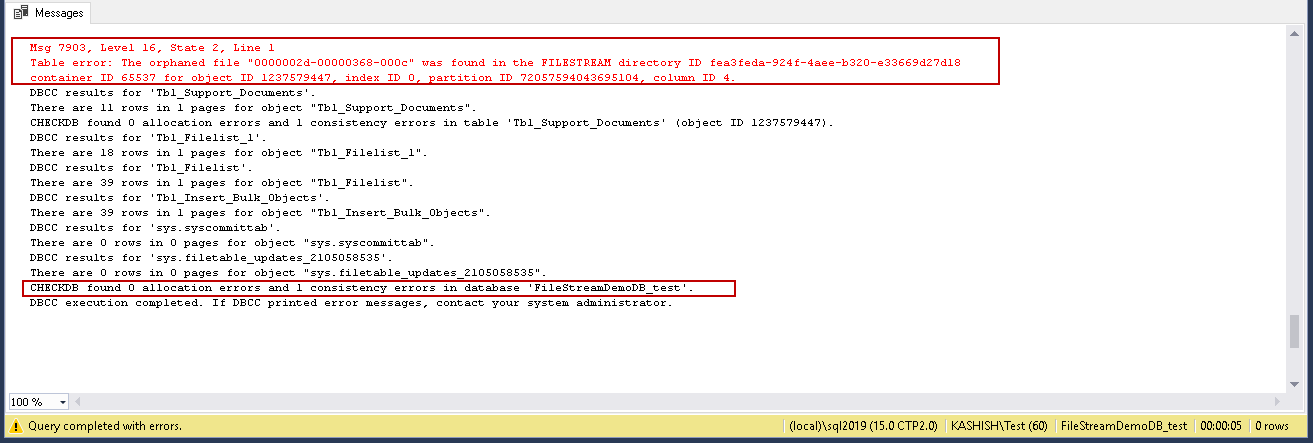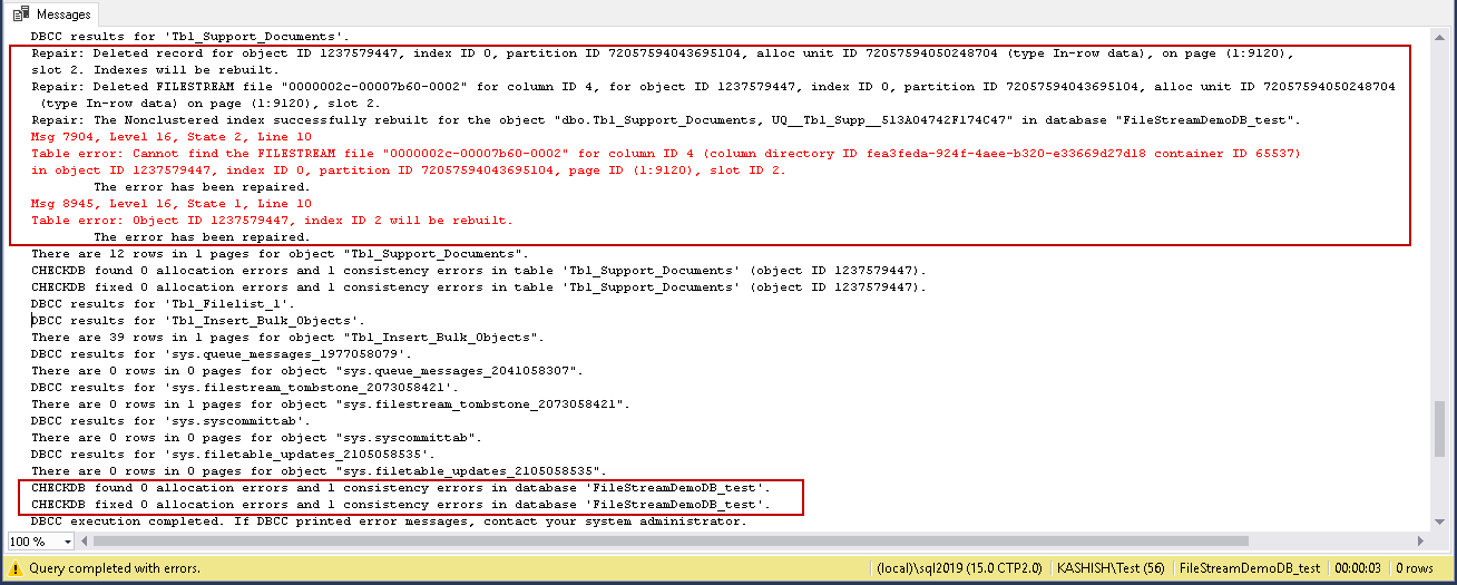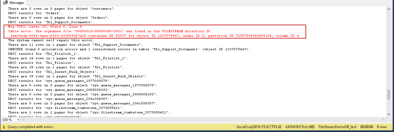 DBCC CHECKDB reported consistency error in table ‘Tbl_Support_Document. It also gives a message that cannot find the FILESTREAM file. You can see in the following screenshot that the error is for the same file we moved from the FILESTREAM container earlier.