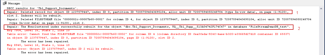 1DBCC CHECKDB('FileStreamDemoDB_test', repair_allow_data_loss)Let us understand this output message. In first part, it deletes the row from the FILESTREAM table for the deleted file.
