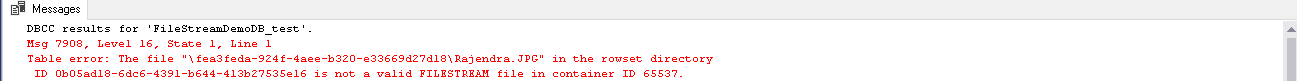 We get the consistency error again in the FILESTREAM database, and it gives the message that the file ‘Rajendra.PNG’ is not a valid FILESTREAM file in the container.