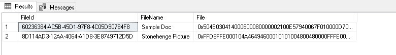 DECLARE @File varbinary (MAX); SELECT @File = CAST( bulkcolumn as varbinary(max) ) FROM OPENROWSET(BULK 'C:\sqlshack\Stonehenge.jpg', SINGLE_BLOB) as MyData; INSERT INTO DemoFileStreamTable_1 VALUES ( NEWID(), 'Stonehenge Picture', @File )