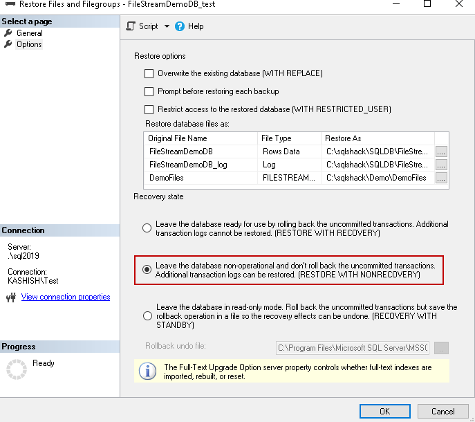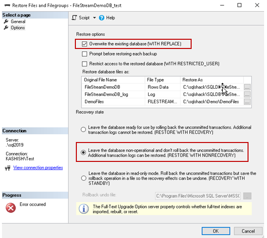 Now, let us restore the filegroup level backup and put the database in ‘NoRecovery’ mode. We can restore further transactions log when the database is in ‘NoRecovery’ mode. Click on ‘Options’ and put a check on ‘Leave the database non-operational and don’t roll back the uncommitted transactions (Restore with NoRecovery).’