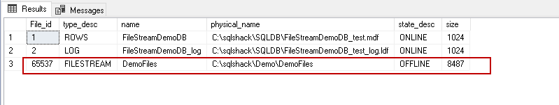 In the below image, check the status for the FILESTREAM database file, it is showing the status as ‘Offline’ for the FILESTREAM.