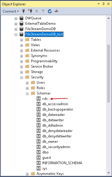 Once we have enabled CDC, it creates a new schema ‘CDC’ in the FILESTREAM database as shown below.