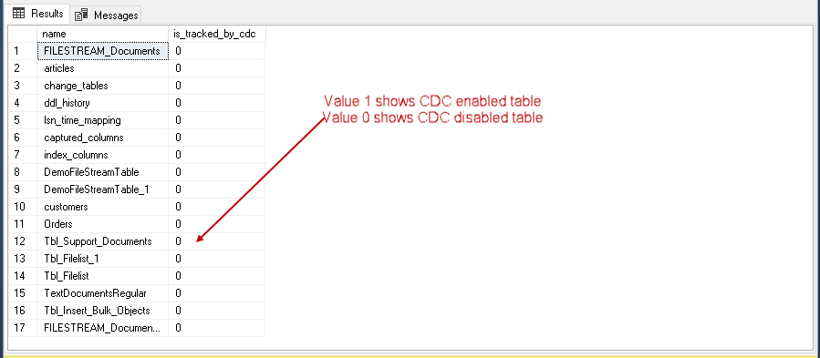 We need to enable the CDC on the FILESTREAM table for which we want to track the changes. We can check it first using ‘sys.tables.’ whether any existing table is CDC enabled or not.