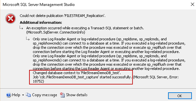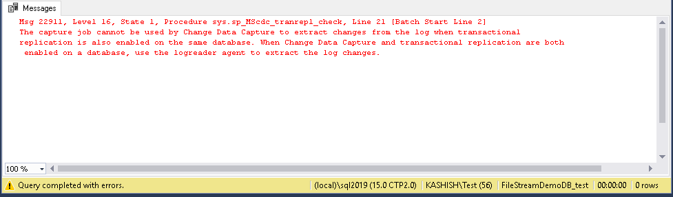 We get an error message this time. It shows that capture job cannot be used by CDC to extract the changes from the log because transaction replication is enabled on the FILESTREAM database. In the last article ‘ SQL Server FILESTREAM and Replication’, we configured the SQL Server replication on the FILESTREAM database. We cannot use CDC and Replication together because Replication also tracks the changes from the transaction log.