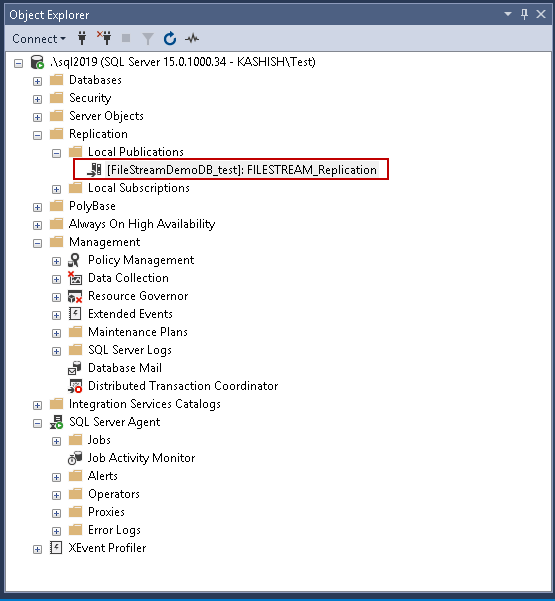 Expand the Replication folder in the SSMS and we can the replication is still configured for the FILESTREAM database. We need to drop it to use the CDC feature on the SQL Server FILESTREAM database.