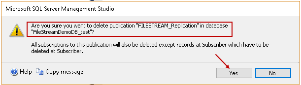 We need to confirm deleting the publication in the SQL FILESTREAM database. It will also delete the subscriptions configured for the particular publication as well. Click on ‘Yes’.