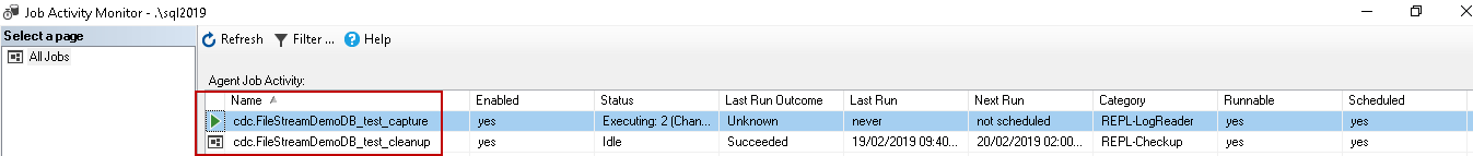 - cdc.FileStreamDemoDB_test_capture: This job is responsible for tracking the changes and it runs the stored procedure ‘sys.sp_MScdc_capture_job’