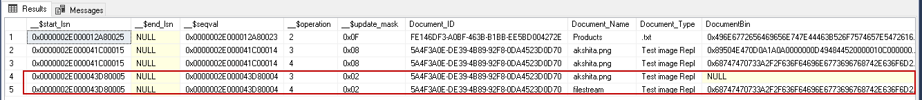 In the CDC table, you get two rows this time. If you look at the _$operation column values, we have value ‘3’ (old update values) and ‘4’ (update after values). In the above update query, we just updated the SQL FILESTREAM object; therefore, we do not see any changes in the document_name column. We always get two rows for the update statement in the CDC tracking table.