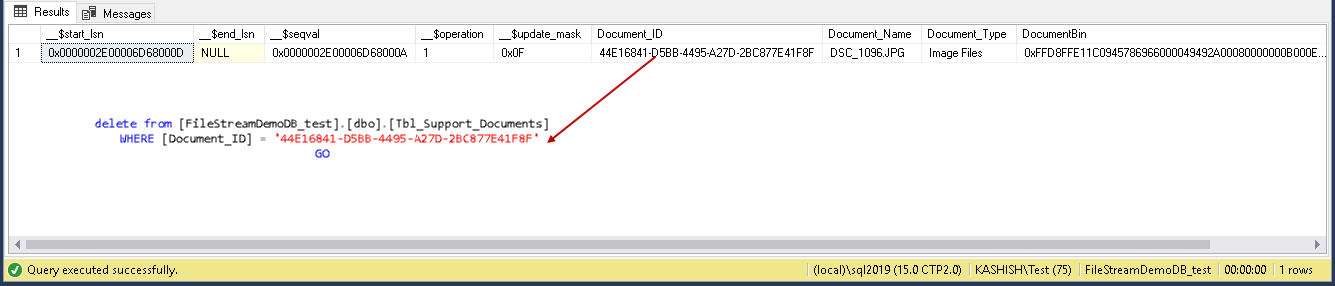 Delete from [FileStreamDemoDB_test].[dbo].[Tbl_Support_Documents] WHERE [Document_ID] = '5A4F3A0E-DE39-4B89-92F8-0DA4523D0D70' GO |
