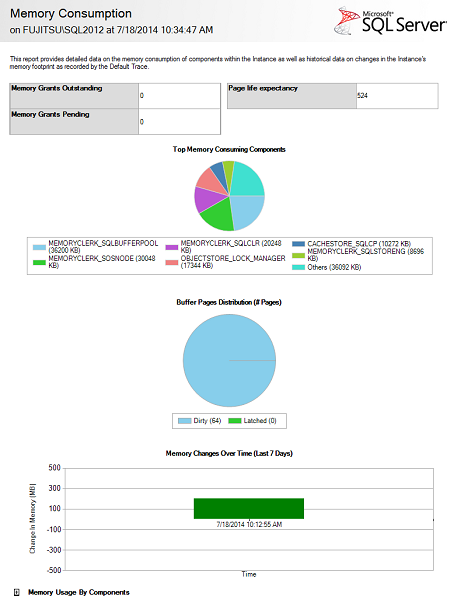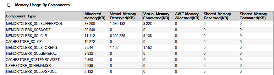 The Memory usage by components section, when expanded, shows a long list of SQL Server components and the allocated, virtual, and shared memory reserved and committed. This information can also be obtained by querying the sys. dm_os_memory_clerks dynamic management view. MEMORYCLERK_SQLBUFFERPOOL is usually the biggest memory consumer.