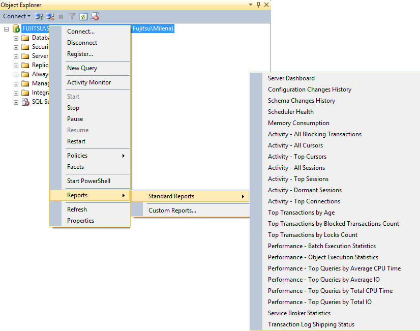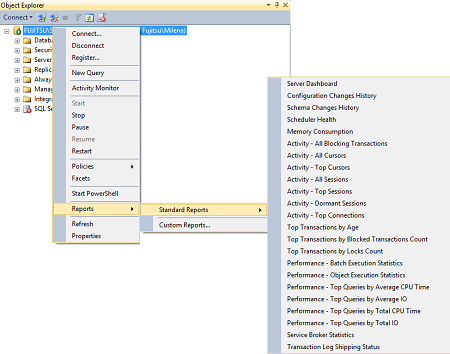 - In SQL Server Management Studio Object Explorer, right-click the SQL Server instance if you want the instance level reports, or the database object node for adequate standards reports