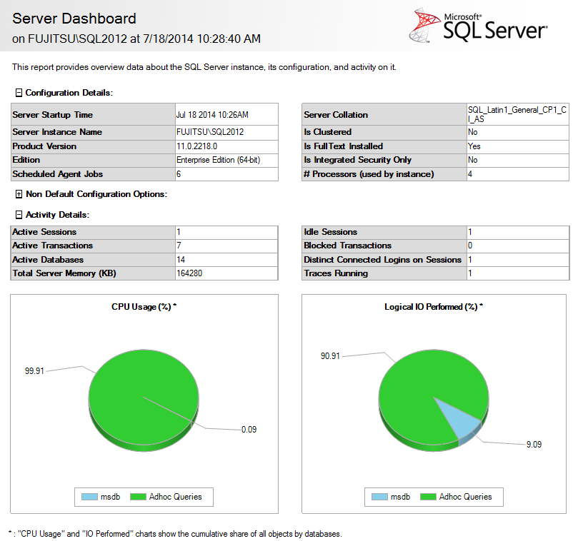 Server dashboard Contains the information commonly analyzed when it comes to SQL Server performance monitoring. It shows the basic information about SQL Server instance configuration, settings, and activity in charts and tables: configuration details, non-default configuration options (in case you’ve modified the default instance settings), activity details, and graphs for processor usage and I/O performed.