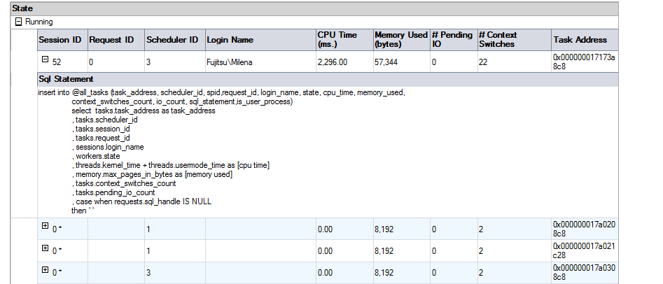 It shows the tasks that are currently executed on your SQL Server instance, so this information is also useful for performance and blocking troubleshooting. Besides the executed statement, the reports also shows processor time, memory used, pending IO. Blocked and blocking tasks are shown in a separate section.