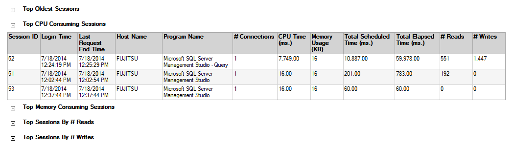 Activity There are seven available activity reports that show information about active sessions (both internal and external), connections, cursors, and transactions. The report shows top oldest, CPU consuming, and memory consuming sessions, as well as top sessions by number of reads, and by number of writes.