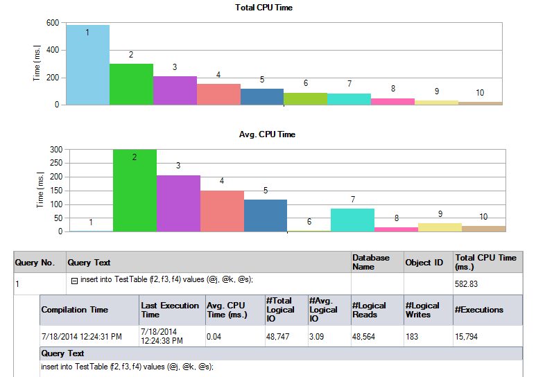 Performance –Top Queries by Average CPU Time and Top Queries by Total CPU Time These report show ten most expensive queries when it comes to processor time usage. The information they show is the same, just grouped and presented differently. They show the exact query (system or user) executed, the database and object they are executed against, and the number of milliseconds the processor needed to process each of these queries.