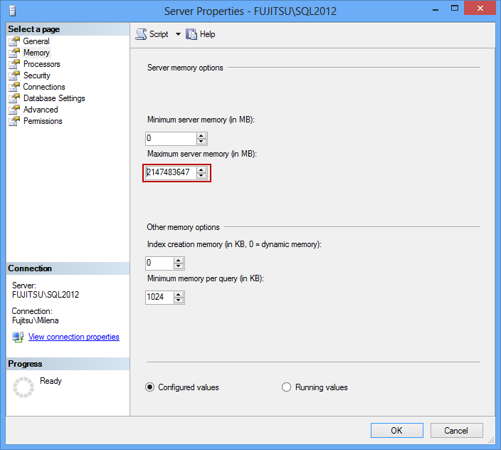 Set the Maximum server memory (in MB) to approximately 80% of available physical memory, in order to leave enough memory for the operating system