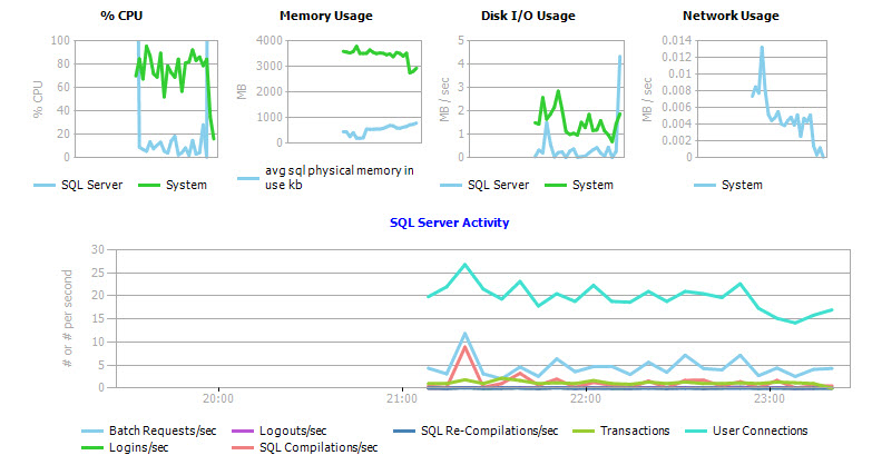 The Server Activity collection set collects information about resource usage (CPU, memory, disk I/O, and network), SQL Server waits, instance activity (batch requests, logouts, SQL compilations and recompilations, transactions, user connections, and logins), and operating system activity. Data is collected every 60 seconds and uploaded in cached mode every 15 minutes