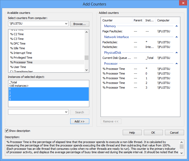 - To add more counters, repeat step 3. In this example, we’ve added Processor – %Processor Time total for each processor, Physical Disk – Current Disk Queue Length, and Network Interface – Packets/sec (for all and for a specific network adapter)