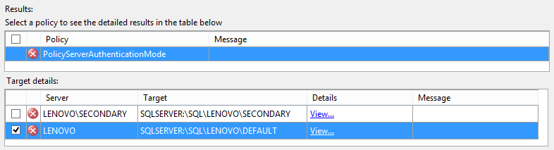 Certain policy types, depending on the conditions used within, offer immediate reconfiguration of SQL Server instances (or other policy defined targets). To do that, check the box next to the server name and click Apply. In our case the LENOVO SQL Server instance will switch from the mixed (both Windows Authentication and SQL Server Authentication) mode to the Windows Authentication mode.
