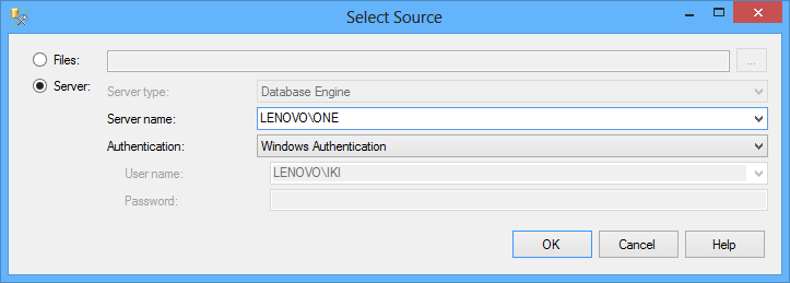 The Evaluate Policies dialog will open. Use the Source option to select the source of Policy Based Management policies. Use the Files option to browse for exported to XML policies, or the Server option to select a SQL Server instance which hosts declared policies we want to evaluate on instances in the Production Servers group.