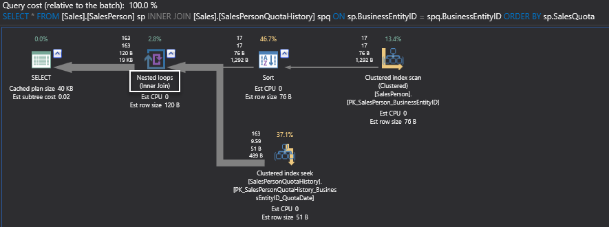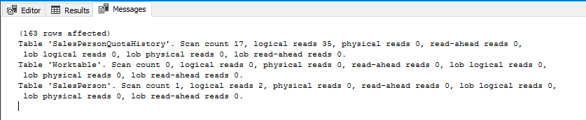 SET STATISTICS IO ON GO SELECT * FROM [Sales].[SalesPerson] sp INNER JOIN [Sales].[SalesPersonQuotaHistory] spq ON sp.BusinessEntityID = spq.BusinessEntityID ORDER BY sp.SalesQuota GO SET STATISTICS IO OFF GO |