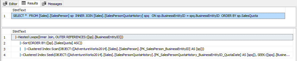 SET SHOWPLAN_TEXT ON GO SELECT * FROM [Sales].[SalesPerson] sp INNER JOIN [Sales].[SalesPersonQuotaHistory] spq ON sp.BusinessEntityID = spq.BusinessEntityID ORDER BY sp.SalesQuota GO SET SHOWPLAN_TEXT OFF GO |