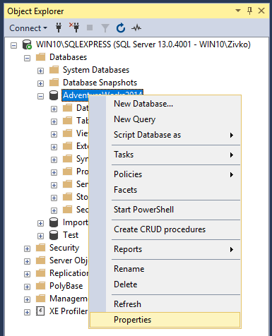 To enable SQL Server Query Store for a database on on-promise SQL Server, right click on a database in Object Explorer and from the context menu, choose the Properties option: