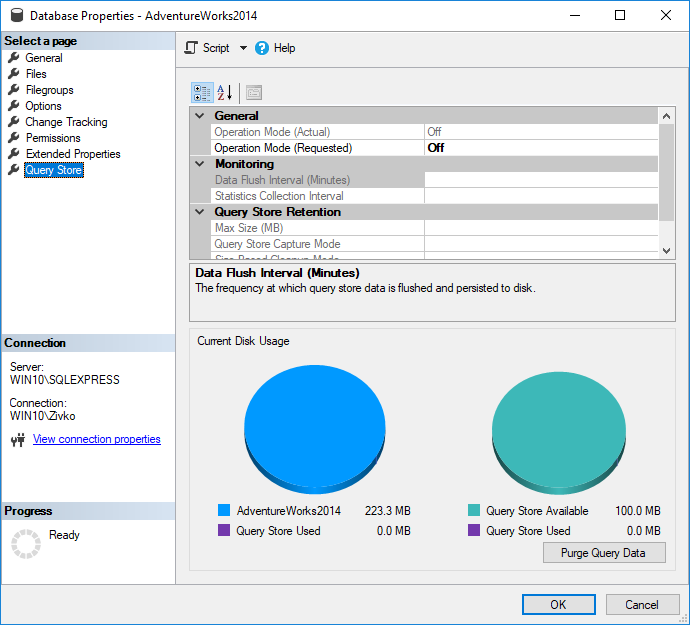 The last option on the SQL Server Query Store tab is an option that clears/purges all data in the SQL Server Query Store by pressing the Purge Query Data button: