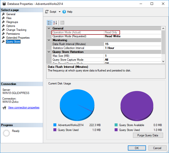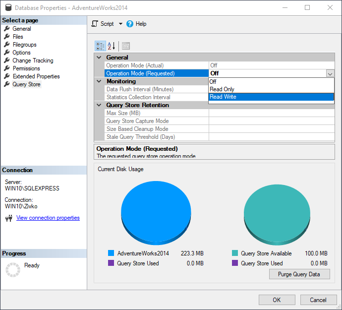 In the Operation Mode (Requested), in the drop-down box, the same options can be set as those mentioned for the previously option. Setting here the values will directly have impact on the state of the Query Store.