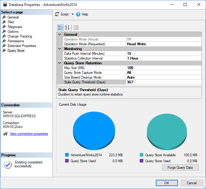 By pressing the OK button on the Database Properties dialog, the SQL Server Query Store is enabled to capture query execution plans and runtime information.