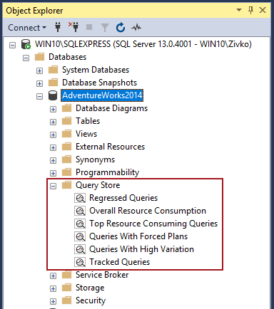To confirm that the SQL Server Query Store is enabled on the chosen database, go to Object Explorer, refresh and expand the database. The SQL Server Query Store folder will appear with the list of available built-in reports: