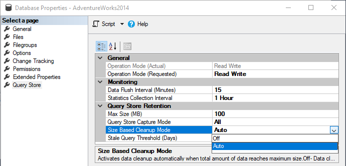ALTER DATABASE AdventureWorks2014 SET QUERY_STORE = ON ( SIZE_BASED_CLEANUP_MODE = AUTO ); |