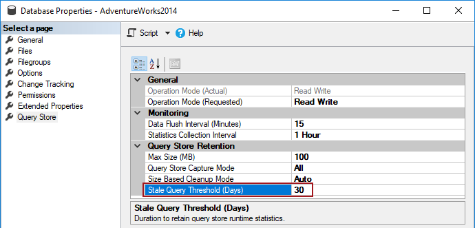 The Stale Query Threshold (Days) option is for defining how long the data will stay in the SQL Server Query Store. By default, it is set for 30 days